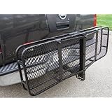 Brand new 60" x 20" Steel Folding Hitch Mounted Cargo Carrier Basket. Fits Class III or larger 2" trailer hitches - weight capacity 500 lbs. This folding basket features a pull-pin design to conveniently fold up and out of your way. Steel mesh bottom and sturdy 5½" tall side rails found on the cargo basket, protect your luggage or cargo from most objects. Each cargo basket assembly is quick and easy. Safety reflective sticker are included to ensure your folding basket will be visible in low-light conditions. This rack includes a 1 Year Warranty.